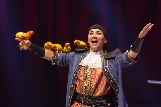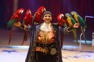 Gianluca Ranzan wird von zehn prachtvollen Aras in die Manege begleitet. Zwei von ihnen starten zu Beginn des Auftritts aus der Gardine heraus zu etlichen Flugrunden durchs Chapiteau während der Tierlehrer die übrigen Schützlinge auf ihren Sitzen platziert. Auf einem Tisch zeigen die intelligenten Papageien ihr Können. Unter anderem hissen sie eine Flagge, fahren Rollschuh und platzieren einen Ball in einem Korb. Akrobatisch wird es bei einer Rolle und dem laufen über die ausgebreiteten Arme eines Zuschauers. Ein Schwarm kleiner goldfarbener Sittiche landet auf den Armen von Ranzan. Abschließend beeindrucken drei Paare Aras mit langen Flügen über dem Zuschauerraum.