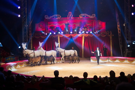 Unter der eleganten Peitschenführung von Angie Biasini läuft in der besuchten Vorstellung die Cavallerie des Hauses Amar ab. Je drei weiße Araber und dunkelbraune Ponys interagieren temperamentvoll in variantenreicher Weise. Viele Lauffiguren spielen geschickt mit dem Größenunterschied, z.B. laufen die Ponys unter den Arabern hindurch, und den kontrastierenden Fellfarben der Pferde. Eine Reihe gelungener Da Capo Steiger beenden die Darbietung.