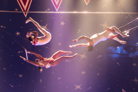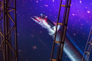 Mit dem Fliegenden Trapez der Truppe von Félix Galéoti beginnt der zweite Programmteil. Je zwei FliegerInnen arbeiten sehr hoch in der Kuppel und in weitem Abstand vom Sicherheitsnetz ihre zahlreichen Sprünge. Sehr sicher werden die unterschiedlichen Saltos ausgeführt und allesamt in den Händen des Truppenchefs gelandet. Mit einer elegant ausgeführten Passage findet der Auftritt seinen gelungenen Abschluss.