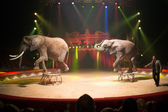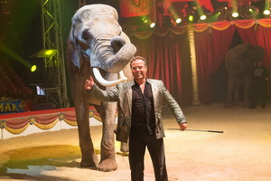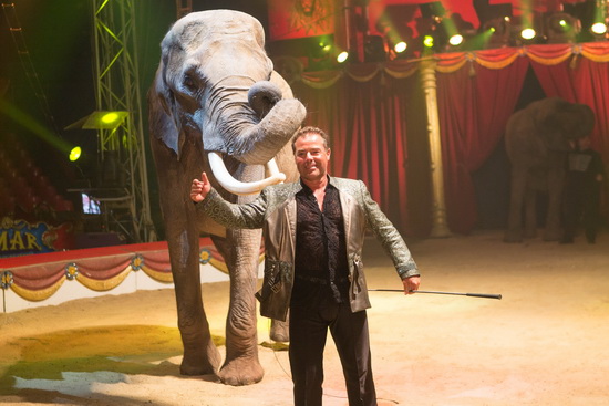 John Falck bringt die beiden afrikanischen Elefanten des Cirque Amar in einer schwungvollen Dressurfolge in den roten Ring. Abwechslungsreiche Laufarbeit mit einer Vielzahl an Tricks wird in gelungener Weise mit akrobatischen Übungen, wie z. B. Hochsitzern auf den Tonneaus kombiniert.