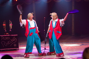 Die Pedro Rivelinos Clowns sind mehrfach im Programmablauf präsent. Mit einer musikalischen Reprise wird der Käfigabbau überbrückt und mit einer Hutjonglage unterhalten sie die Zuschauer während das Netz der fliegenden Menschen abgebaut wird. Ihr großes Entree bietet viel Musik auf Trompeten und Saxophon. Das Geplänkel der Auguste mündet sich in eine „Boxschule“, in der es zunächst am Punchingball heftig zur Sache geht. Unter dem lebhaften Gekreische der Kinder tragen die beiden Protagonisten schließlich ihren Boxkampf aus.