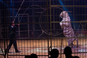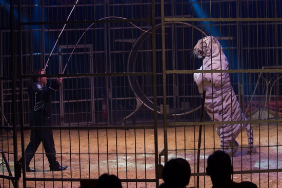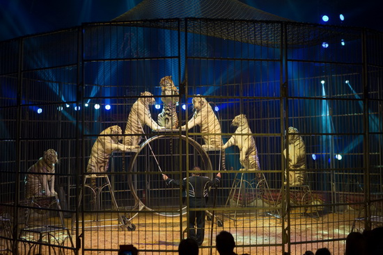 Wie zumeist im traditionellen französischen Circus steht eine Raubtierdressur am Beginn des Programms. Direktor John Falck präsentiert sechs weiße und einen normalfarbenen Tiger in einer schwungvoll präsentierten und abwechslungsreichen Trickfolge. Pyramide, Sprungvarianten, Hochsitzer, Teppich, Rollover und Fächerlauf werden souverän gemeistert. Eindrucksvolle Vorwärts- und Rückwärtssteiger sind die abschließenden Höhepunkte.