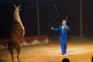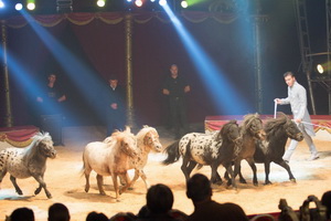 Die weiteren Tier-Darbietungen sehen John jr. Und Mickael Falck, die Söhne von André Falck und Angela Biasini als Vorführer. Vier Kamele und drei Dromedare lässt Mickael in einem schwungvoll vorgetragenen Ablauf ihr erlerntes Können zeigen. Souverän präsentiert der junge Mann die mächtigen Trampeltiere und bietet zum Da Capo den furiosen Vorwärtssteiger eines Lamas. Sein erst sechzehnjähriger Bruder John jr. Ist zunächst mit sechs munteren Tigerscheck-Ponys zu erleben. Vielfältige Lauffiguren kennzeichnen den flotten Ablauf und verschiedene Steiger zweier weißer Araberhengste bilden den idealen Abschluss des Auftritts.