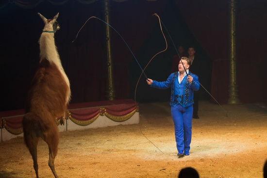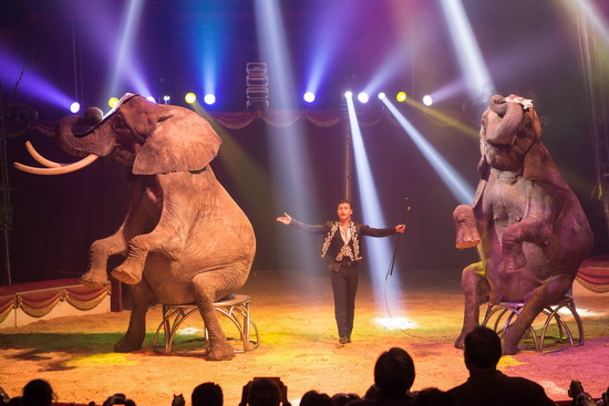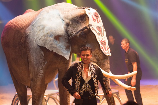 Wenig später ist der jugendliche Vorführer mit den beiden hauseigenen afrikanischen Elefanten im roten Ring zu erleben. Schwungvolle Laufarbeit wechselt mit akrobatischen Übungen, wie z.B. Hochsitzern auf den Tonneaus ab.