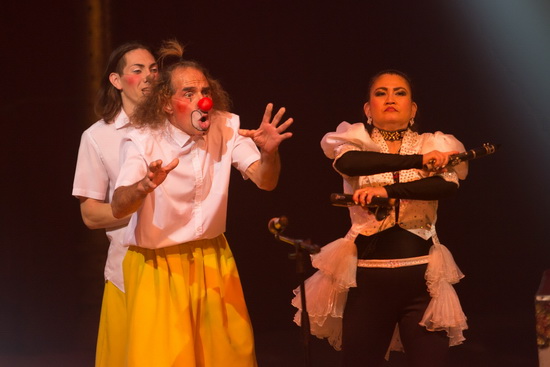 Das Clowns Trio „Cardinali“ beginnt sein umfangreiches Entree musikalisch. Die Weißclownin stimmt in der Manegenmitte eine Melodie auf der Gitarre an und über die Gradintreppen kommen die Auguste Guilherm und William mit ihren Trompeten dazu. Mit vielen Gags und reichlich Klamauk kommen sie beim Publikum sehr gut an. Immer wieder zeigen die Herren ihr musikalisches Talent, so z.B. beim virtuosen Spiel einer Geige in außergewöhnlichen Positionen und beim Glockenspiel.