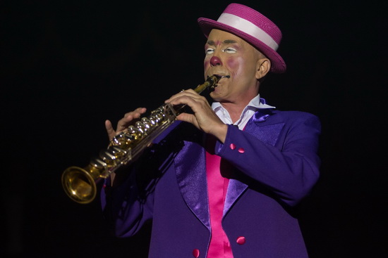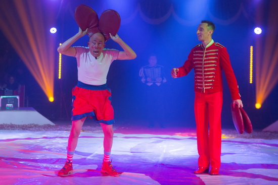Clown Capuccino war in drei Auftritten zu erleben. Mit Ausstrahlung, großer Spielfreude und Können nahm er die Zuschauer sofort für sich ein. Die erste Reprise gestaltete er mit romantischem Spiel (Petit Fleur) auf dem Tenor Saxophon. In einem weiteren Auftritt, der mit Grandeza absolviert wurde, wurden etliche Logen-Besucherinnen mit „Luftballon-Blumen“ bedacht. Im großen Entrée übernahm Rhodes Dumas den seriösen Part und mit Verve brachten die beiden Komödianten das Box-Entrée. Unter lautem Gekreische, Jubel und begeistertem mitgehen der zahlreichen Kinder liefen die Aktionen ab. Schließlich verabschiedeten sich die Clowns mit gekonntem Trompetenspiel.