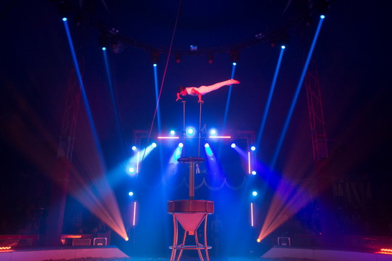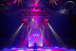 Der Artisteneingang aus elegant gerafftem, schwerem rotem Samt wird von modernen Beleuchtungselementen, die zahlreiche Effekte ermöglichen eingerahmt. Etliche dieser Leuchten sind zudem ringsum auf der Piste platziert. Die bestens ausgestattete Lichtanlage ist an einem hoch über der Piste hängenden Gitterrohrring montiert.Mit einem exzellenten, ausgefeilten Lichtdesign wird in Show in beispielhafter Weise in Szene gesetzt und die auftretenden Artisten perfekt unterstützt.