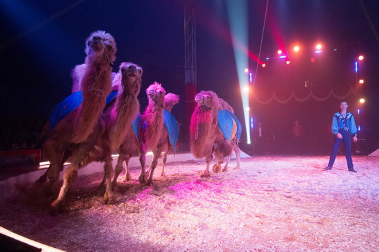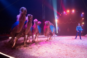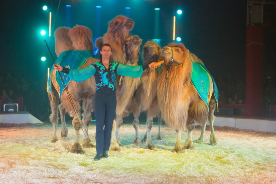 John Caplot präsentiert im Programmverlauf die beiden weiteren Dressur-Darbietungen des Hauses. Zunächst zeigen vier Steppenkamele unter seiner versierten und souveränen Peitschenführung eine umfangreiche Abfolge vielseitiger Lauffiguren. Vier Rinder unterschiedlicher Rassen, darunter zwei Watussi mit höchst prachtvollen Hörnern, komplettieren den Ablauf. Schließlich läuft ein temperamentvolles Welsh-Pony Achten um die auf Tonneaus stehenden Rinder und abschließend sind Lamas als Springer zu erleben.