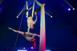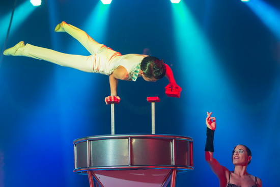 Enzo Caplot, zwölfjähriger Sohn von Steeve Caplot, verblüffte mit einer Handstandequilibristik der absoluten Extraklasse. Der relativ kleine Junge verfügt bereits über enorme Kraft, enorme Körperbeherrschung, enorme Ausdauer und enorme Ausstrahlung. Nach den ersten Handstandfiguren auf einem hohen chromblitzenden Piedestal baut er gekonnt Klötzchentürme auf. Es folgen perfekt gearbeitete Einarmer. Er führt einen erstklassigen Kopfstand, ohne Vorteil – ohne Kopfring, auf der Mittelsäule des Piedestals aus, während diese hoch in Richtung Kuppel ausfährt und sich hernach wieder absenkt. Doch diese Spitzenleistung war bei Weitem noch nicht der Abschluss seiner Evolutionen. Auf der immer wieder hochfahrenden Säulen, die durch Handstäbe immer noch weiter verlängert wird, folgen in immer größerer Höhe Handstände, Einarmer und Handstandwaagen in Perfektion, wobei auch beim umsetzen von einer in eine andere Position keine Unsicherheiten zu erkennen sind. Chapeau.