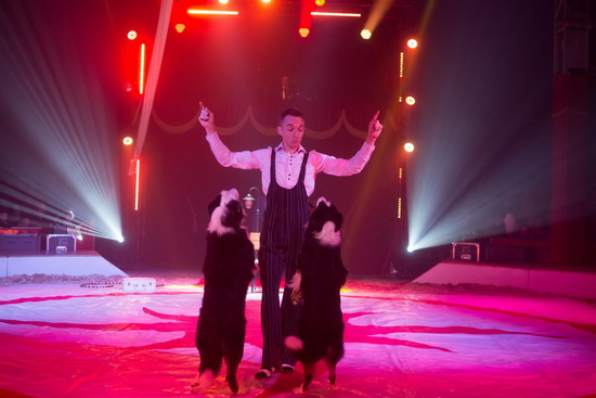Rhodes Dumas komplettiert mit seiner Hunde-Revue die Reihe der Dressur-Darbietungen. In einem verspielt wirkenden Ablauf bieten die beiden Border Collies ihr erlerntes Können eifrig dar. Viele verschiedene Sprünge, u.a. auch über eine geschwungene Fahne werden temperamentvoll ausgeführt.