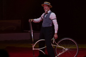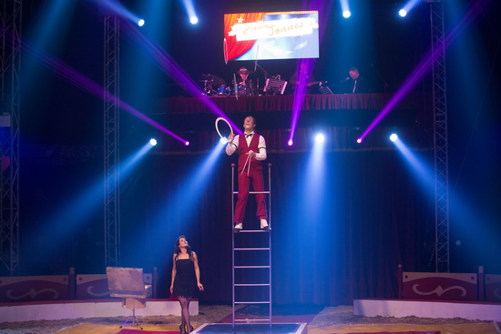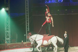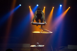 Mit seiner temperamentvollen Arbeit auf der Rola-Rola begeistert Paolo Kaiser auch in dieser Manege. Als cooler Macho reiht er die hochkarätigen Tricks aneinander - springt Seil, stapelt im Sprung mehrere Rola-Bretter unter seinen Füßen und springt von einer Rola zu einer weiteren auf einem niedrigeren Podest. Beeindruckend ist immer wieder der Rückwärtssalto von einer zu anderen Rola.