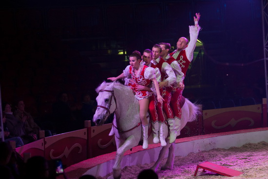 Die beiden weiteren Darbietungen mit Tieren präsentiert die Familie Donnert. Zunächst arbeiten Emilia und Richard ihr stimmungsvoll arrangiertes Pas de Deux. Zahlreiche attraktive Hebefiguren, die dem klassischen Ballett entstammen, werden elegant auf den Rücken der beiden ruhig laufenden Kaltblüter dargeboten.