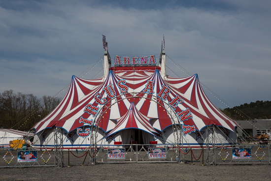 Das hohe Vier-Masten Chapiteau beherrscht den Festplatz in Marburg. Sein elegantes rot-weißes Streifendekor leuchtet im Sonnenlicht und die feinen blauen Applikationen verleihen den Konturen des prächtigen Zeltbaus Struktur. Acht extrem hohe Quaderpools geben der mächtigen Kuppel, über der die Fahnen des Circus wehen, Volumen.