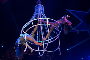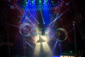 Mit einem ersten Auftritt in der hohen Kuppel des Chapiteau nimmt die Spielfolge ihren Lauf. Angelina Frank und Angela Lauenburger agieren gemeinsam an einem Kronleuchter. Die beiden jungen Frau bieten in charmanter Weise eine Reihe attraktiver Abläufe. Gekonnt werden die unterschiedlichen Posen eingenommen und risikoreiche Aktionen – etwa ein Abfaller in die Arme der Partnerin – bieten Nervenkitzel.