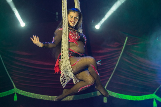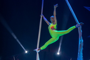 Beide Damen sind zudem solo in harmonischen Luft-Darbietungen zu erleben. Miss Angelina zeigt ihr Können an weißen Strapatentüchern. Vielseitige Haltefiguren wechseln mit weiten Flügen und mit risikoreichen Abfallern lässt die sympathische Artistin den Adrenalinspiegel des Publikums steigen.