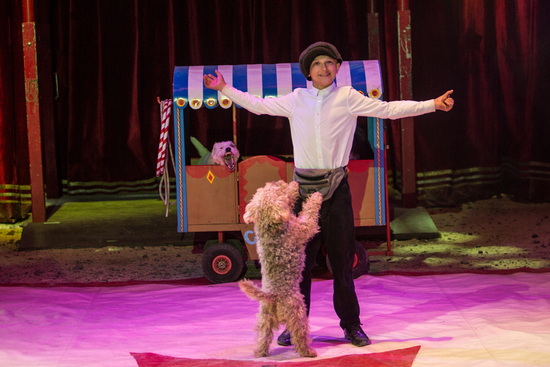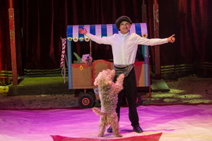 Sein Bruder Santino leitet eine verspielte Hundemeute zu ihren Aktionen an. In einem farbenfroh dekorierten „Circuswagen“ gelangen die Vierbeiner in die Manege und beweisen in allerlei Variationen ihr Sprungvermögen. Auch Roller und „Taxi“ fahren gehört zum Repertoire.