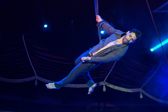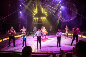 Beherrschendes Element im Zeltinnern ist der prächtige, bis hoch in die Kuppel reichende Artisteneingang aus rotem Samt. Vielseitige goldfarbene Stickerei und Bordüren strukturieren die elegante Konstruktion und viel integriertes Licht setzt es ideal in Szene. Auf einer vorgebauten hoch gelegenen Empore hat die Ein-Personen-Band (Schlagzeug) ihren Platz.