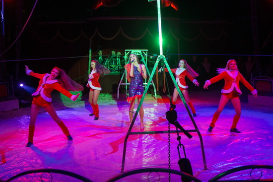Die vier Tänzerinnen des ukrainischen Balletts, in charmanten Weihnachtsfrau-Kostümen, und Sängerin Elena, sie war vorletzte Saison im Zirkus Charles Knie zu erleben, gestalten das schwungvolle Opening.