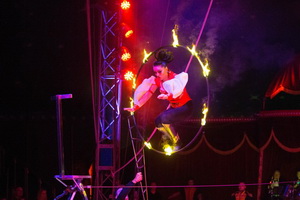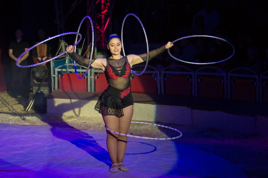 Melanie Alvarez versteht es ausgezeichnet, sich mit ihrem temperamentvollen Hula Hoop Act in Szene zu setzen. In erstklassiger Weise und spielerisch leicht wirkend präsentiert die charmante junge Artistin das Spiel mit den rotierenden Reifen.
