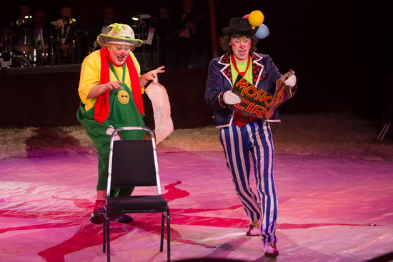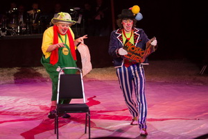 Yuri und Taras kommen aus Moskau und sind typische Vertreter der russischen Clownsschule. Sie sind mit einigen individuellen Auftritten zu erleben und Gestik, Bewegungsabläufe und Reprisenaufbau lassen die erstklassige Ausbildung erkennen. Der Kampf um den einzigen Stuhl steht im Mittelpunkt ihres ersten Auftritts. Wenig später entdecken die beiden völlig neue Arten des Hula Hoop. „Sie liebt mich – sie liebt mich nicht“ heißt es wenig später und als die „Blütenblätter“ einer riesigen Kunstpflanze nicht ausreichen die Frage zu klären setzen die beiden Clowns das Spiel mit ihrer Kleidung fort. Das „reinigen“ der Manege läuft ein wenig aus dem Ruder und in letzten Reprise bittet Yuri zwei Zuschauer zur gemeinsamen „Autofahrt“ in die Manege. Streng wacht der Clown, das der Mitfahrer der angebeteten nicht zu nahe kommt. Nach einer „Motorpanne“ erscheint Taras mit seinem imaginären Motorrad auf der Szene und der Auftritt erhält eine völlig neue Facette.