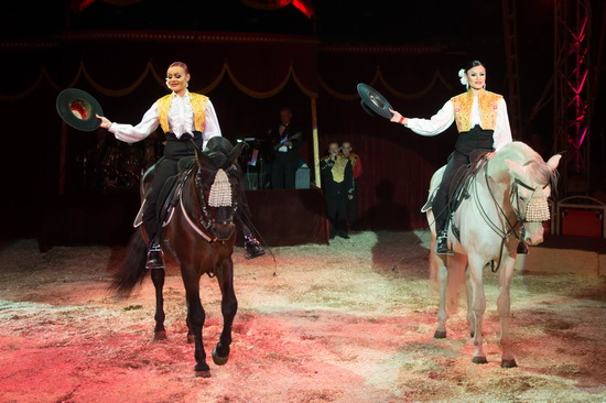 Gekonnt reiten die Zwillingsschwestern Noelia und Natalia Gonzalez vom spanischen Gran Circo Mundial eine erstklassige doppelte Hohe Schule im spanischen Stil.