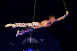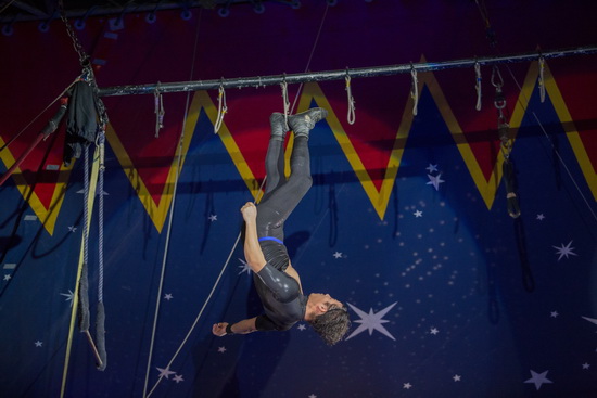 Für atemlose Spannung sorgt Leo Navas mit seinem spektakulären Deckenlauf. Sich nur mit den Füßen in Seilschlaufen haltend quert er die Zeltkuppel. Ein weiteres Mal legt er den Weg mit verbundenen Augen zurück. Ein wagemutiger Sprung von einem zu anderen Trapez bringt den Artisten jeweils zum Ausgangspunkt seiner Exkursionen zurück.