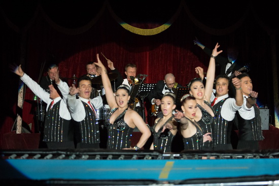 Der dreigliedrige Artisteneingang aus rotem Samt bietet in seinem Mittelteil dem ausgezeichnet und druckvoll mit einem rockigen Sound aufspielenden Orchester Platz.