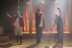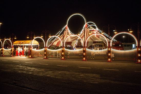 Die eindrucksvolle Front des Circus macht neugierig, hat Charme und verheißt Großes. Ein aufwändig ausgeführter, reich verzierter und viele Meter langer Stakettzaun flankiert das Eingangsportal. Die Lichterbögen und Messingkandelaber an hohen schlanken Säulen setzen die Front mit tausenden in warmen Licht erstrahlenden LED-Birnen perfekt in Szene.
