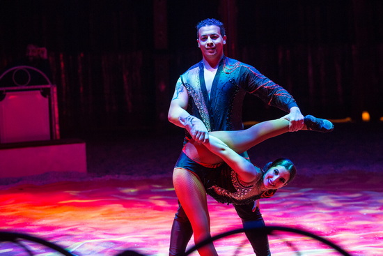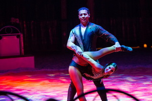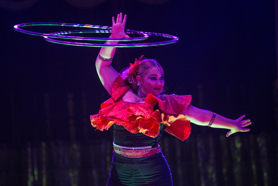 Ashley Barelli hat ihre temperamentvoll vorgetragene Hula Hoop Darbietung neu arrangiert. Den Großteil ihrer fulminanten Aktionen erfolgen auf einem flachen, mit zahlreichen Leuchten versehenen Postament.