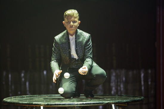 Bounce-Jongleur Francesco Barelli begeistert vor der Pause die Besucher. Der Dreizehnjährige verfügt über eine große Portion Showmanship und präsentiert seine variantenreichen Routinen mit cooler Attitüde. Bis zu sieben Bällen beherrscht der Nachwuchsartist sehr sicher und gekonnt, jongliert diese sowohl „nach oben“, als auch auf einem Piedestal und eine Treppe hinunter.
