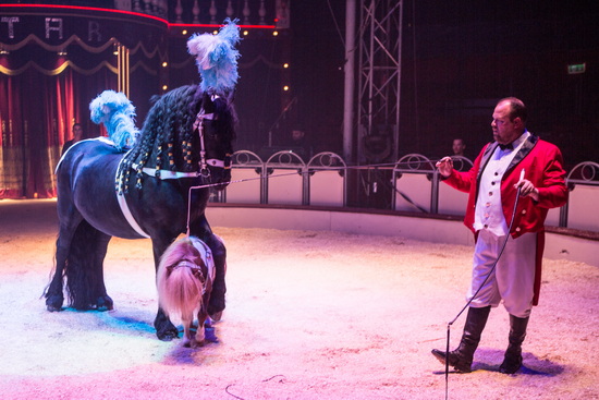 Franz Barelli präsentiert ein harmonisches Groß-und-Klein, bei dem Friesenhengst „Kenzo“ an diesem Abend sein Manegendebut souverän meistert.