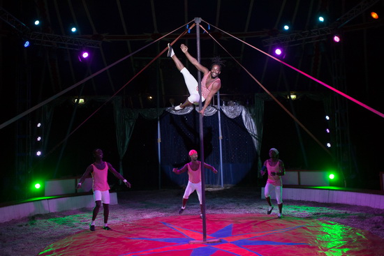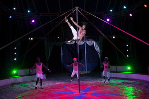 Höchst temperamentvoll gestaltet sich der Programmbeginn. Die vier Artisten der Truppe „Super Boys“ begeistern mit ihrem umfangreichen Können. Sie bauen mit ihren Körpern menschliche Pyramiden und arbeiten variantenreich am Chinesischen Mast. Schwungvoll und gekonnt reihen sich die verschiedenen Tricks aneinander. Mit folkloristischen Elementen, der Balance schnell rotierender bunt bemalter großer metallener Schüsseln, wird der Auftritt aufgelockert und erhält den notwendigen Schuss Exotik.