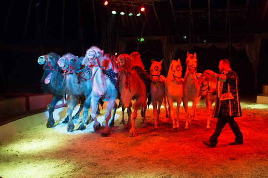Tierlehrer Franz Spindler präsentiert in einem harmonischen Ablauf vier, mit prächtigen schwarz-goldenen Schabracken geschmückte Steppenkamele. Souverän werden die variantenreichen Abläufe ausgeführt und bald erweitern vier weiße Araberhengste die Gruppe zu einem formidablen Achter-Zug. Die komplexen Abläufe erfolgen tempogeladen und in Perfektion. Mit eindrucksvollen und variantenreichen Steigern erreicht die Darbietung ihren Höhepunkt.