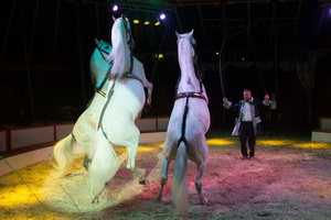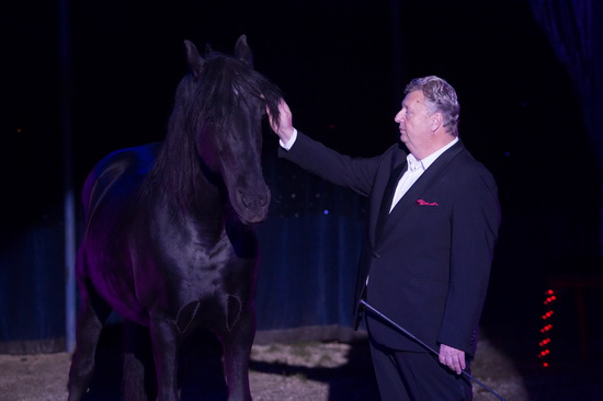 Wenig später präsentiert John Henry Spindler in seiner unnachahmlichen Art den prachtvollen Andalusierhengst „Zorro“ im roten Ring. Es ist immer wieder eine Augenweide, diesen erfahrenen Circusmann erleben zu dürfen. Hervorragende Steiger, Spanischer Tritt entlang der Piste und das tiefe durchstecken des Kopfes zwischen den Vorderhufen sind die Paradeübungen des temperamentvollen Hengstes.