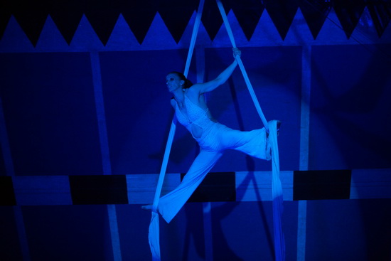 Salima Folco begeistert mit ihrem poetischen, vorzüglich in Szene gesetzten Act an den Strapatentüchern. Weite Flüge füllen den Raum und lassen den Traum vom fliegen Wirklichkeit werden.