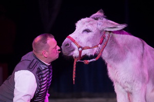 Sein Auftritt mit Esel „Manolito“ ist geradezu zum Klassiker geworden und es ist noch immer nicht klar, wer hier wen vorführt. Den mahnend erhobenen Zeigefingers des Clowns quittiert er mit einem anheben der Oberlippe und behutsam nimmt er einen Futterwürfel von den Lippen des Clowns ab.
