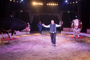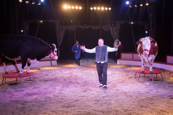 In einem weiteren Auftritt bringt er „die beiden schönsten Damen aus Oberbayern, direkt aus Bad Tölz“ in die Manege. Die beiden Kühe „Milka“ und „Heidi“ ziehen gelassen ihre Bahnen, steigen zum Schrecken manches Logenbesuchers auf die Piste, sie nehmen ihre Plätze auf Tonneaus ein und die Stimmung erreicht ob des folkloristischen Auftritts ihren Höhepunkt.