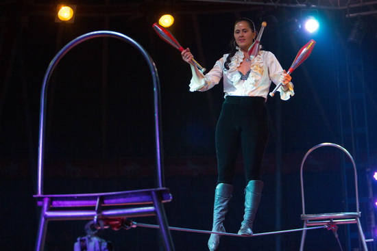 Desirée Köllner präsentiert ihre Künste auf dem Drahtseil. Sie kombiniert wechselweise eine ganze Reihe unterschiedlicher Tanzschritte mit artistischen Übungen. So jongliert sie beispielsweise auf dem Seil mit drei Keulen, springt Seil sowie durch Reifen.