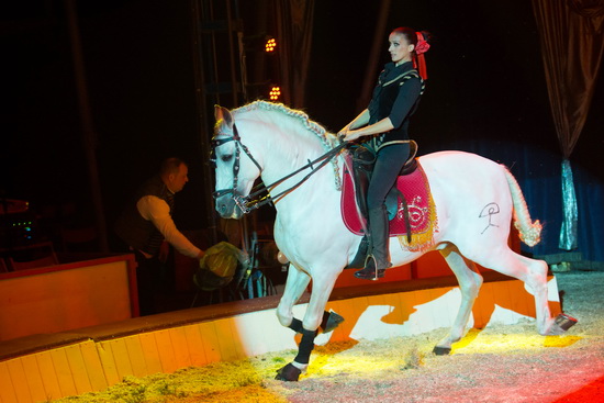 Im weiteren Verlauf der Show erleben wir die sympathische und vielseitige Artistin mit einer vorzüglichen Hohen Schule auf dem Schimmelhengst „Armarando“. Im spanischen Stil beweist die charmante Amazone ihr umfangreiches reiterliches Können auf dem sehr temperamentvollen Andalusier.
