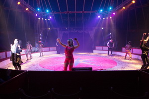 Im Spielzelt empfängt die Besucher eine warme und stimmungsvolle Atmosphäre. Lichterketten über dem Gradin sorgen während des Einlasses für Flair, dekorative rot-cremefarbenen Logen mit bequemen Stühlen und ein siebenreihiges Gradin stehen für die zahlreichen Besucher zur Verfügung und schwere Samtvorhänge umschließen in elegantem Faltenwurf die Beleuchterempore.