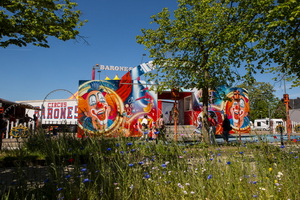 Auf einem von Bäumen gesäumten Parkplatz der lebhaften Kleinstadt war der Circus in Bestform aufgebaut. Der im vergangenen Jahr in Dienst gestellte und mit vorzüglichen, modern interpretierten Circusmotiven dekorierte Fassadenwagen nimmt den zentralen Platz in der Front ein. Er wird flankiert von einem weißen Zierzaun mit Lichterbögen und dem erhaben ausgeführten Logo des Unternehmens.