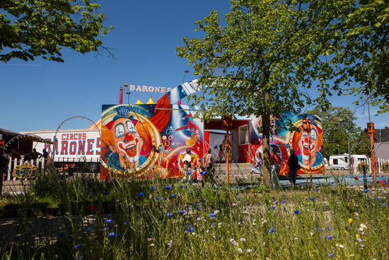 Das bekannte rot-gelbe Chapiteau, dessen lange Kuppel drei Spitzen krönen, ist die Spielstätte. Der moderne, strahlend weiß lackierte und mit großen roten Lettern beschriftete Fuhrpark sowie die Wohnwagen der Direktion und Artisten nehmen den Platz ein.
