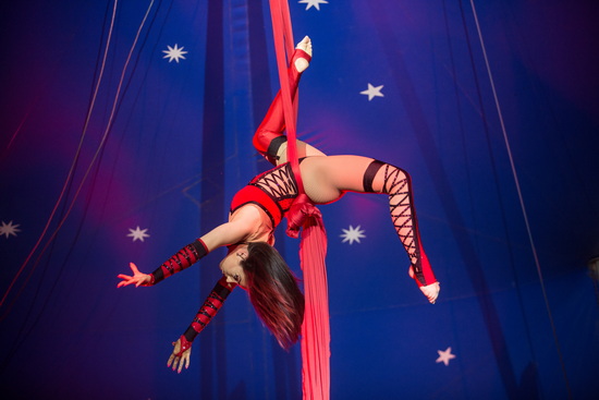 An roten Strapatentüchern präsentiert Theresa Wolf ihre gekonnte Luftakrobatik. Die umfassende Abfolge der relevanten Tricks des Genres wird von der sympathischen jungen Frau in erstklassiger Weise ausgeführt. Weite Flüge füllen die Kuppel und risikoreiche Abfaller sind das Highlight des Auftritts.