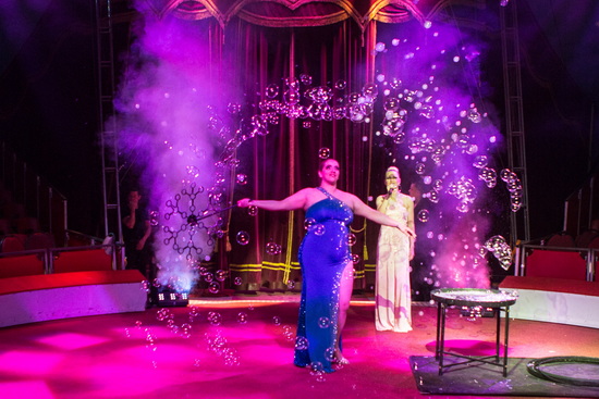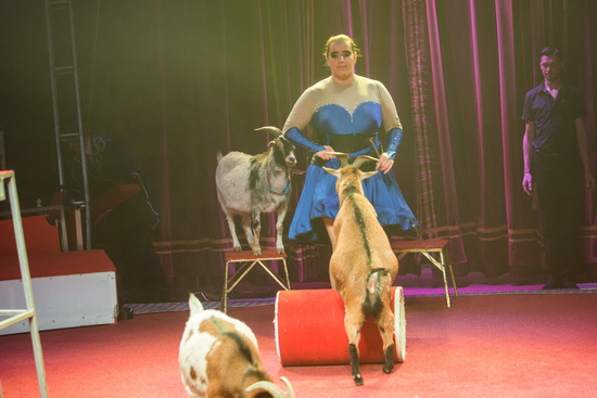 Wenig später präsentiert Ramona Barones drei Ziegen in einem flotten Ablauf. Balkenlauf, Reifensprung und laufen auf einer Rolle gehören zum Repertoire. Im zweiten Teil der Show sehen wir die junge Frau mit einer poetisch inspirierten Seifenblasen-Darbietung. Begleitet wird der Auftritt mit stimmungsvollem Live-Gesang, der der Darbietung einen besonderen Drive verleiht.