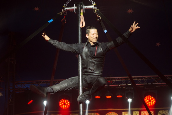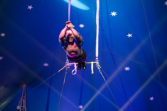 Am Trapez sehen wir ihn im zweiten Programmteil. Nach einer Trickfolge am ruhenden Requisit erfolgen eine Anzahl Loopings um eine Welle, bei denen der verwegene Artist sich nur mittels Metallstiften an den Schuhen an der Welle einklinkt.
