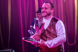 Tempo-Jongleur David Korittnig präsentiert vielseitige Routinen mit Keulen. Rasant und sehr sicher erfolgen die unterschiedlichen Figuren mit bis zu fünf Requisiten. Im zweiten Teil des Auftritts sind Ringe die Requisiten der Wahl. Variantenreich werden bis zu sieben manipuliert und nach einer kleinen Comedy-Einlage mit seinem Buder und Manegensprecher sind es gar acht Ringe, die sicher manipuliert werden.