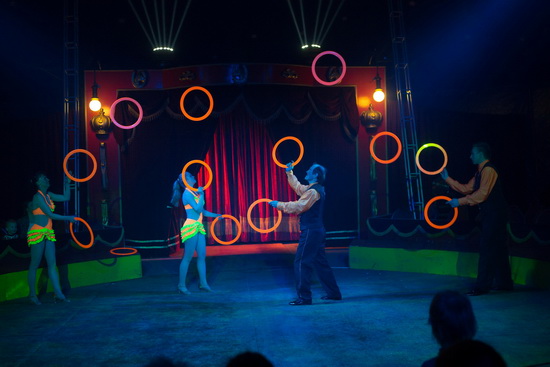 Mit einer Gruppenjonglage im Schwarzlicht erleben wir einen schwungvollen Programmauftakt. In zahlreichen Variationen werden die Routinen mit fluoreszierenden orangenen Ringen von den vier Akteuren geboten. Immer wieder wechseln die Formationen, in denen die Passings souverän ausgeführt werden.