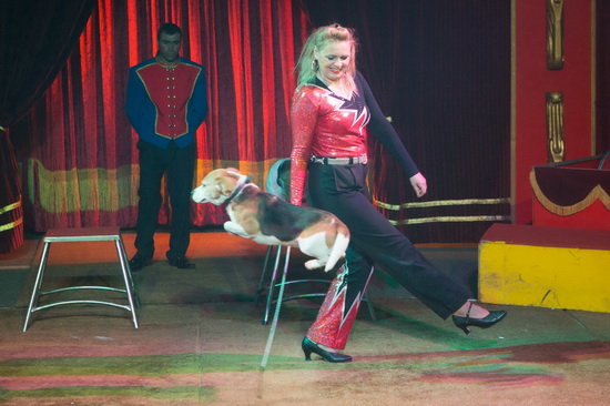 Den Reigen der Darbietungen mit Tieren komplettiert Ewa Koritnig-Barones mit zwei Hunden, die in spielerischem Ablauf ihr Können zeigen. Eifrig und voller Begeisterung folgen die beiden Vierbeiner den Anweisungen ihrer Vorführerin. Verschiedene Sprünge, z. B. durch einen Ring, übereinander und über Hürden wechseln mit Hochsitzern und laufen auf den Vorderpfoten ab.