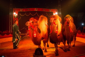 Mit zwei weiteren Dressurdarbietungen erleben wir den Chef des Hauses direkt vor und nach der Pause. In einem erstklassigen Ablauf bietet die selten zu sehende Kombination von drei Lamas und drei Ponys eine abwechslungsreiche Figurenfolge. Gekonnt vereint der erfahrene Vorführer die unterschiedlichen Temperamente der beiden Tierrassen zu vielseitigen harmonischen Bildern. Mit furiosen Hürdensprüngen der Lamas und Steigern der Ponys findet der Auftritt seinen gelungenen Höhepunkt. Im zweiten Auftritt, den das hauseigene Ballett in idealer Weise einleitet, bringt Richard Koritnig die drei, im letzten Jahr erworbenen jungen Kamele – Kaspar, Melchior und Balthasar – in den roten Ring. Sie beherrschen bereits ein umfangreiches Repertoire, dass ruhig und sicher geboten wird.