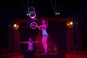 Denise Farkas bietet einen hervorragenden Auftritt auf dem Schlappseil. Die jugendliche Artistin jongliert gekonnt mit Ringen und lässt dabei einen Teller auf einem Mundstab rotieren. Sie steigt auf dem Seil auf eine Rola, bietet somit eine spektakuläre Balance.